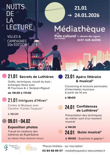 | Du 21/01/2026 au 24/01/2026 à Scey sur Saône et Saint-Albin Les nuits de la lecture Découvrez le programme de la Médiathèque des Combes pour Les nuits de la lecture : 21 janvier : - Secrets de luthières - Intrigues d'hiver* 23 janvier : - Apéro littéraire et musical* 24 janvier : - Confidences de luthières* - Quiz musical* Gratuit, entrée libre. *Animations sur inscription, places limitées Inscription au 03 84 68 89 07 ou par mail Lieu : Médiathèque, Pôle culturel des Combes, 1 chemin des vignes Email : mediatheque@cc-descombes.fr |