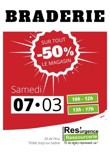 | Le 07/03/2026 à Scey sur Saône et Saint-Albin Braderie à la ressourcerie La ressourcerie Res’urgence organise sa première braderie de l’année le samedi 7 mars, dans son magasin. À cette occasion, une remise de -50% sera appliquée sur l’ensemble du magasin. Mobilier, objets du quotidien, livres, jouets, décoration ou encore textile : toute la boutique sera à moitié prix. De 10h à 12h et de 13h à 17h Lieu : Ressourcerie Res'urgence, ZA de l'écu, Scey-sur-Saône Email : contact@res-urgence.org |