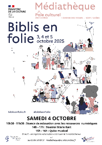| Le 04/10/2025 à Scey sur Saône et Saint-Albin Bibliothèque en folie A l'occasion de l'évènement national "Biblis en folie", la médiathèque intercommunale des Combes organise une journée d'animations avec au programme : Séance de relaxation avec les ressources numériques, tournoi de Mario Kart et quiz musical Ouverture de la médiathèque à 10h 10h30 - 11h30 : Séance de relaxation 14h - 17h : Tournoi Mario Kart 15h - 16h : Quiz musical Lieu : Médiathèque des Combes, 1 chemin des Vignes à Scey-sur-Saône Contact : 03 84 68 89 07 Email : mediatheque@cc-descombes.fr |