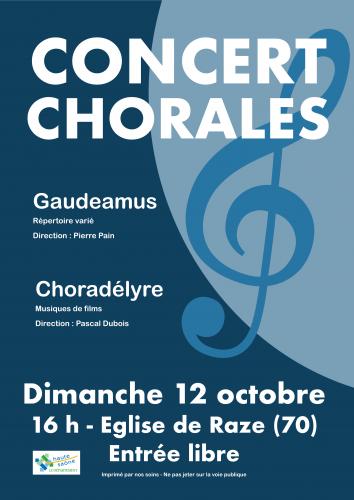 | Le 12/10/2025 à Raze Concert de Chorales Concert donné par les chorales Gaudeamus de Vesoul et Choradélyre de Noidans le Ferroux, au profit de la restauration de l'église de Raze. Entrée libre. Dimanche 12 octobre, de 16h à 18h Lieu : église de Raze Email : pascal70130@gmail.com |