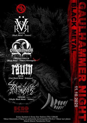 | Le 11/10/2025 à Scey sur Saône et Saint-Albin Nuit Black Metal Une soirée dédiée aux sonorités extrêmes, avec un plateau 100% métal underground. Quatre groupes viendront plonger la salle dans une atmosphère sombre et intense, entre riffs furieux et univers occultes. Un rendez-vous immanquable pour les amateur·ices de la scène black métal et ses déclinaisons. En partenariat avec l’asso Gaulhammer, pilier de la scène métal locale. Ouverture des portes à 20h30 Lieu : Echo System, Z.A. L'Écu à SCEY-SUR-SAONE TARIFS : 15€/prévente 18€/sur place 6€/moins 12 ans Billetterie disponible à l'office de tourisme à Scey-sur-Saône Email : billetterie@echosystem70.fr |