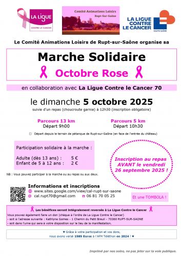 | Le 05/10/2025 à Rupt sur Saône Marche solidaire suivie d'un repas pour Octobre Rose Marche solidaire pour octobre rose suivie d'une tombola et d'un repas choucroute le dimanche 05 octobre 2025. 9h00 : départ parcours de 13 kms 10h30 : départ parcours de 05 kms 12h30 : repas Tarifs marche : 5€ 2€/de 5 à 12 ans Tarifs repas : 20€ 12€/enfants Réservation au 06 81 70 05 25, et avant le 26 septembre pour le repas. Lieu : Au terrain de pétanque de Rupt sur Saône Email : cal.rupt70@gmail.com |
