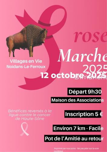 | Le 12/10/2025 à Noidans le Ferroux MARCHE ROSE MARCHE DE 7 KM ENVIRON - FACILE DÉPART MAISON DES ASSOCIATIONS 9H30 Participation 5 € reversés à la ligue contre le cancer de Haute-Saône Au retour apéritif offert DIMANCHE 12 OCTOBRE à 9H30 Lieu : MAISON DES ASSOCIATIONS |