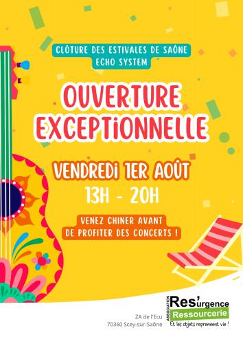 | Le 01/08/2025 à Polaincourt et Clairefontaine Ouverture exceptionnelle - Clôture des Estivales de Saône Ouverture exceptionnelle de la ressourcerie À côté d’Echo System Vendredi 1er août — 13h > 20h non-stop Venez chiner, découvrir et partager un moment festif avant les concerts ! Entrée gratuite Tous renseignements au 09 84 11 82 96 Modes de paiement acceptés : espèces, CB et chèque bancaire Site internet : http://www.res-urgence.org |